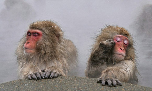 两只日本雪猴紧闭双眼,身旁蒸汽缭绕。