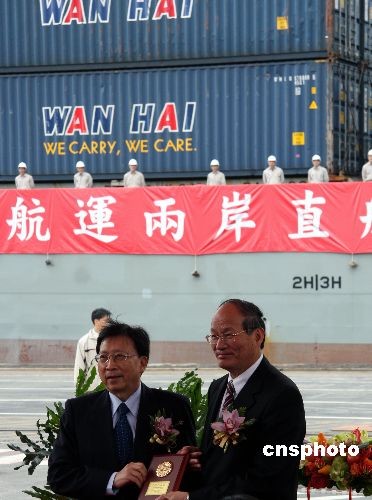12月15日上午,台湾行政当局负责人刘兆玄率同“陆委会主委”赖幸媛、海基会副董事长高孔廉、“交通部次长”游芳来与台湾知名航商负责人共同出席“两岸海运直航基隆港首航仪式”。