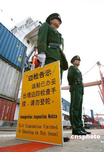 边防战士为首航船舶办妥出境边防检查手续,守护在码头。
