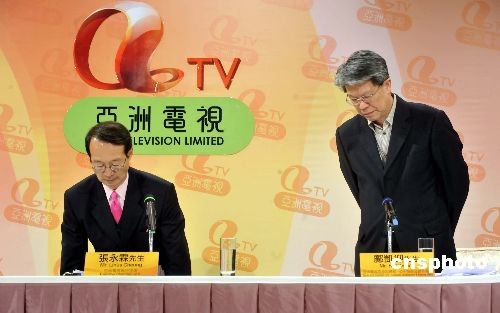 十二月十五日,香港亚洲电视执行主席张永霖(左)、高级副总裁邝凯迎在大埔总台举行的记者会上称,二零零八亚洲小姐竞选赛果与投票结果不符,亚视将对此进行调查。图为二人就事件鞠躬道歉。中新社发 邓庆乐 摄