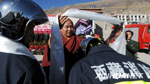 12月15日,西藏拉萨哲蚌寺僧人向寺院消防大队官兵敬献哈达。 格桑达瓦 摄