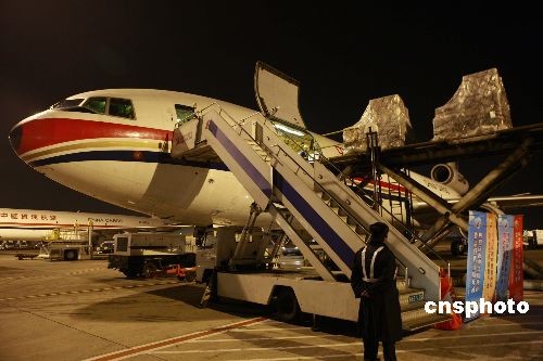 12月17日凌晨0点10分,中国货运航空有限公司的航班号为ck261次包机从上海浦东机场起飞,预计将于1点40分抵达台北桃园机场,这是上海地区首架直航抵台的货运包机。图为ck261次包机在浦东机场装运货物。中新社发 汤彦俊 摄