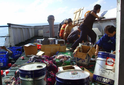 就在歹徒进攻受挫的时候,船员们的反击开始了。驾驶楼里8条高压水枪从舷窗里有力地射出去,形成交叉火力,射得歹徒站立不稳。一只只“土燃烧瓶”从天而降,虽然没有强大的杀伤力,但足以吓阻歹徒的进攻。
