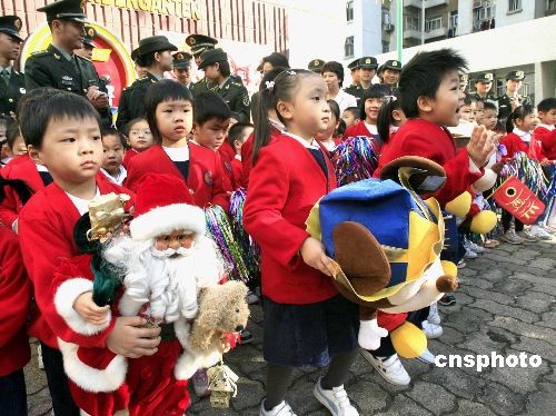 十二月十八日,解放军驻港官兵前往佳宝幼稚园(屯门分校)探访了幼童。驻军官兵与幼童做游戏、讲故事并向园方捐赠了图书、玩具及圣诞礼物。中新社发 张勤 摄