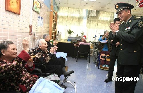 图为驻军副参谋长王文大校慰问年过百岁的长者。中新社发 张勤 摄