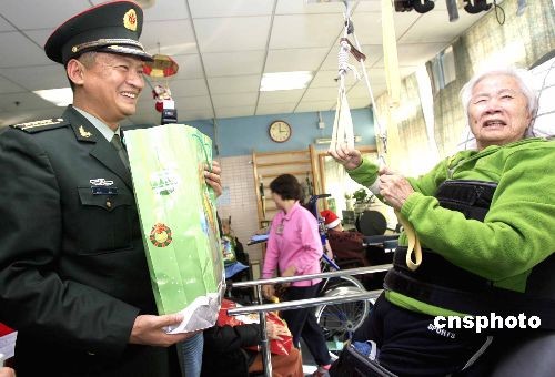 图为驻军副参谋长王文大校送礼物于长者。中新社发 张勤 摄
