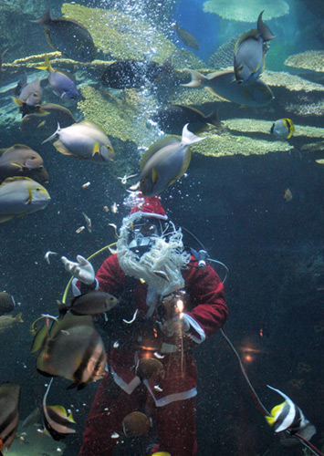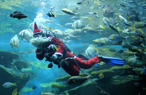 组图:“圣诞老人”下水与鱼儿共迎圣诞