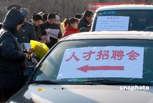 12月20日,由多家人才机构联合举办的“2008年农展迎新春人才招聘会”在北京举行。因应聘者众多,招聘会临时把汽车改作“售票窗口”。中新社发 郑雄增 摄