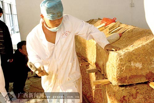 知道了“三合土”棺椁的厚度,专家组也就基本确定了内部木棺椁的位置。随后,现场人员又在“三合土”棺椁的一个侧面切割一条约3厘米左右宽、约20厘米宽高的槽,确定木制棺盖的具体位置和现状。20日下午,开棺工作继续进行。现场人员沿着内棺棺盖线环切外层棺椁,并使用钉木楔的方法将“土椁”顶盖直接顶开。由于“三合土”与木制内棺黏合非常紧密,这一工作得倍加小心。