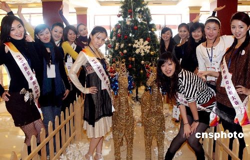 图为参赛佳丽在圣诞装饰景前拍照。