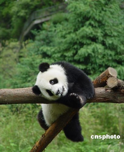 2005年5月27日拍摄的圆圆,爬上树枝荡秋千。中新社发 衡毅 摄