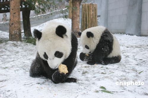 2006年1月,卧龙降雪团团圆圆玩滚雪球。中新社发 衡毅 摄