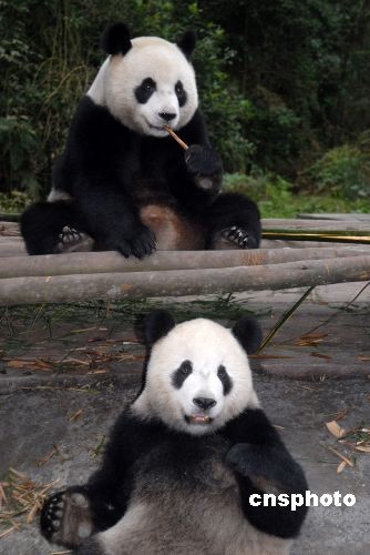 2008年12月,圆圆很贪吃 ,团团:“我的那份竹子呢?”。中新社发 罗小韵 摄