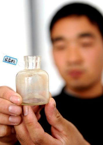工作人员在展示一只在勘探现场发现的玻璃瓶。 李勇 摄