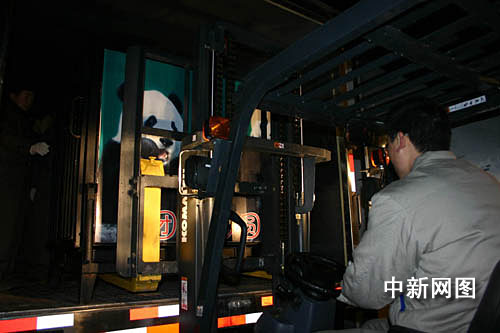 12月23日7时26分,工作人员正在将已装笼的赠台大熊猫“团团”“圆圆”运至卡车。作者 霍潺