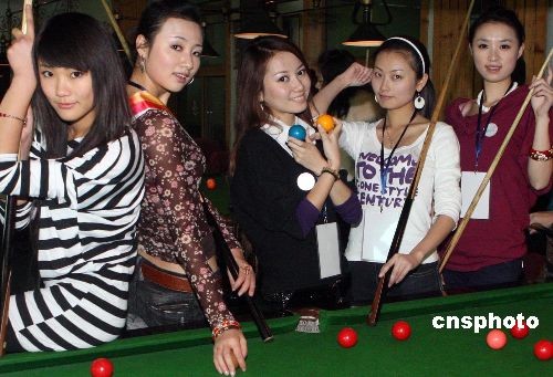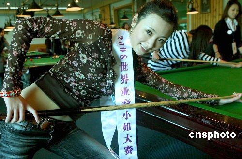 12月23日,正在北京参加2008世界亚裔小姐大赛中国区总决赛的佳丽在嘉年华游乐园游览拍照,各种游乐项目吸引佳丽。图为参赛佳丽练习打台球。中新社发 钱兴强 摄