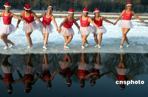在中国吉林,圣诞老人雪地里跳天鹅湖。