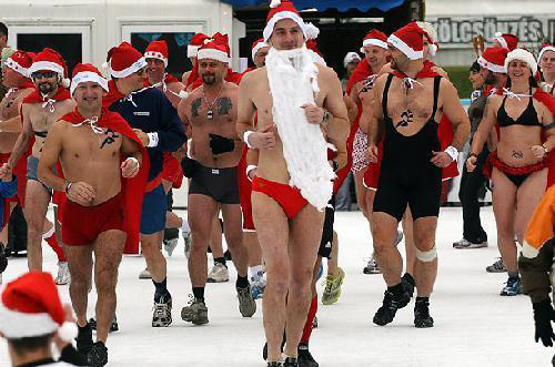 在匈牙利,圣诞老人玩起裸奔赛跑。