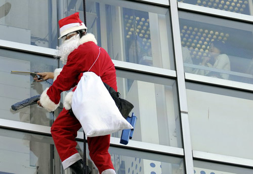 在日本首都东京的TOKO海滨购物中心,打扮成圣诞老人模样的“蜘蛛人”在清洗玻璃窗时挥手。