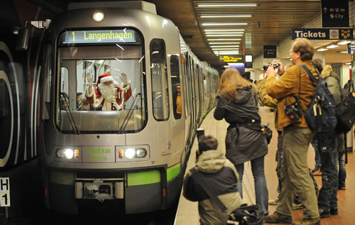 在德国汉诺威的一个地铁站,装扮成圣诞老人模样的列车司机向站台上的人们招手。