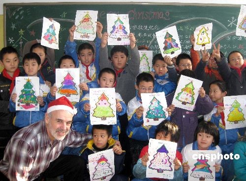 12月24日,河北邢台双语小学的孩子们,与在邢台工作的加拿大籍友人罗杰一同庆祝圣诞节,在祝福外国友人节日快乐的同时,还送上了亲手制作的圣诞礼物。中新社发 陈雷 摄