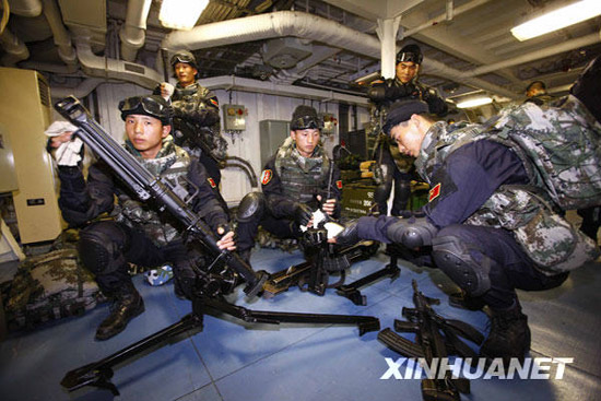 12月25日,海军特战队员在军舰舱室里擦拭武器。