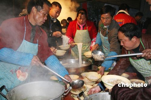 图为韶山当地民众在韶山村做“福寿面”。中新社发 邓霞 摄