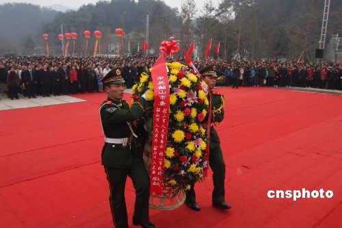 李敏、毛新宇一家等毛主席亲属在韶山毛泽东铜像广场为纪念毛泽东诞辰115周年敬献花篮。 中新社发 郭国权 摄