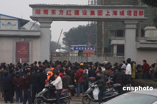 许多人在长沙市井湾子韶山南路634号湖南东方红建设集团上海城19栋项目部发生建筑施工升降机挂篮坠落事故现场围观。中新社发 郭国权 摄