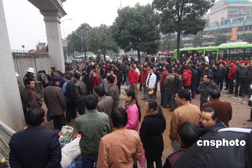 许多人在长沙市井湾子韶山南路634号湖南东方红建设集团上海城19栋项目部发生建筑施工升降机挂篮坠落事故现场围观。中新社发 郭国权 摄