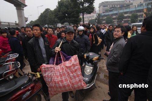 一民工拿行李回家。 中新社发 郭国权 摄