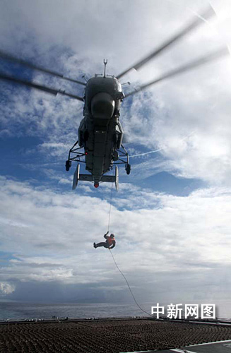 “海口”舰队员进行海上舰机协同滑降训练(2)