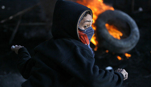 图:巴勒斯坦男孩向以色列士兵投掷石子