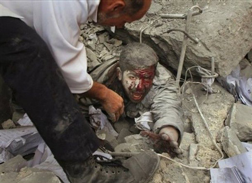 28日,一名被压在废墟下的巴勒斯坦人在求救。