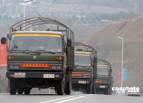 2008年终前,成都军区抗震救灾部队冒着余震重返灾区,每天出动一千多辆军车向北川、汶川、绵阳、安县、江油等地震重灾区运输重建家园急需的砖头。中新社发 贾国荣 摄