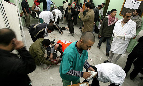 12月29日,在加沙地区北部的一家医院,巴勒斯坦伤员躺在地板上接受医护人员的治疗。 由于以色列对加沙地带的持续封锁,加沙医院的医疗条件非常恶劣。空袭造成的大量人员伤亡让加沙医院几乎面临崩溃。