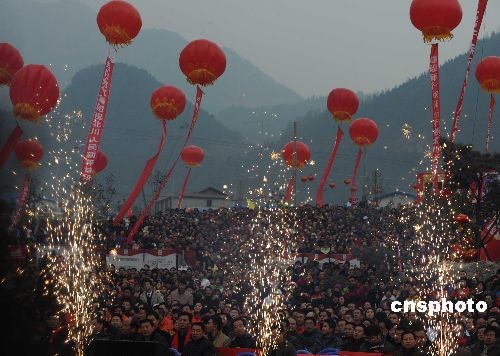 12月31日,四川大地震极重灾区的北川县上万民众干部团聚擂鼓镇,燃放简单的焰火迎元旦,告别难忘的2008年。中新社发 贾国荣 摄