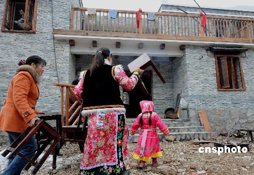 12月31日,四川地震极重灾区的北川县一户羌族灾区民众,在2008年最后一天搬进猫儿石新建的羌寨农家。中新社发 贾国荣 摄