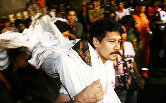 一名消防员在搬运尸体。