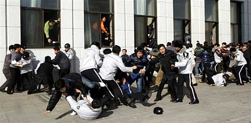 1月3日,在韩国首都首尔,警察(穿灰白色上衣者)阻止反对党成员爬窗进入国会。韩国主要反对党民主党议员自2008年12月26日起占据了国会大会议厅内的议长座位,以阻止执政的大国家党单方面通过一系列有争议法案。