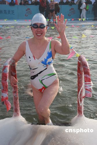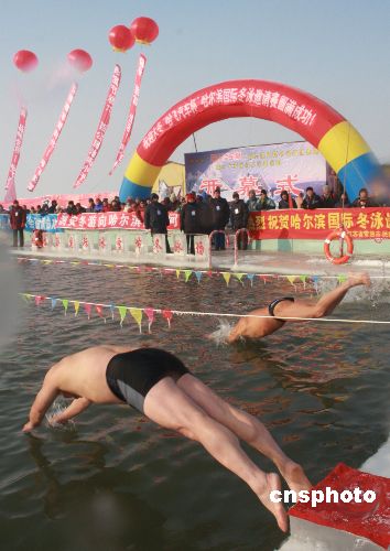 1月5日,由黑龙江省哈尔滨总工会等单位主办的哈尔滨国际冬泳邀请赛在哈尔滨举行。来自杭州、兰州、大连等35个城市42个代表队以及俄罗斯伊尔库斯克等地区的400名男女冬泳运动员参加了此次冬泳邀请赛。