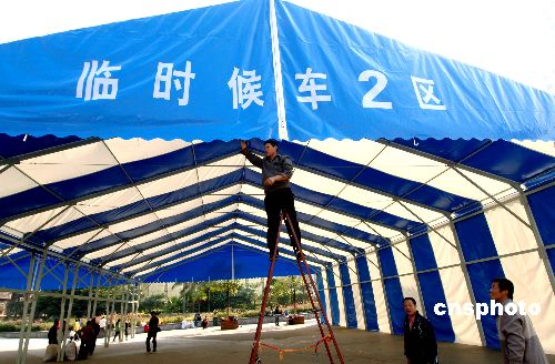 1月5日,一名工人正在福州火车站广场前搭建的临时候车区内进行最后安装。中新社发 刘可耕 摄