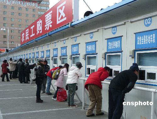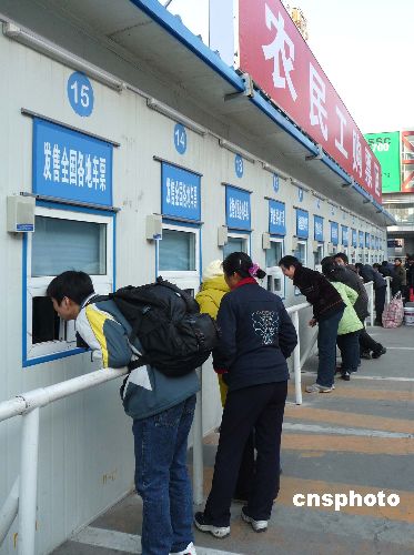 1月5日,北京西站西广场上的70余个春运“临时售票窗口”开始启用,旅客纷纷在此购买去往全国各地的火车票。据悉,2009年北京的春运工作已从原来的1月11日提前至1月1日,2月19日结束,为期50天。今年春运的特点是学生流和民工流探亲流三流重叠,春运压力空前集中。针对近日来迅猛增长的节前客流,春运期间北京站和西站将会在站前广场开辟临时售票窗口,方便旅客购票。