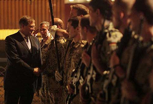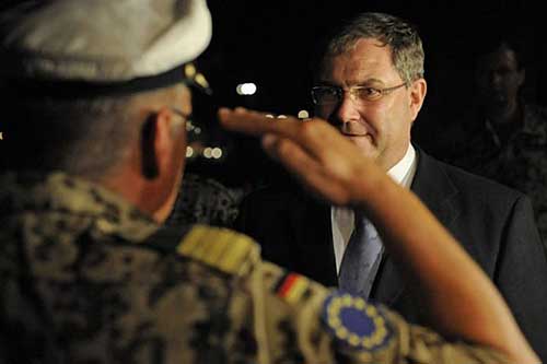 近日,德国国防部长弗朗茨·约瑟夫·容为参加欧盟领导的打击海盗行动的德国官兵送行,此次行动德国派出了卡尔斯鲁赫(Karlsruhe)号护卫舰参与。
