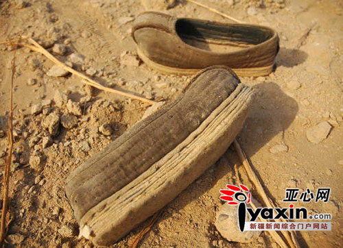干尸出土时所穿的圆口千层底儿布鞋,鞋子底厚、针脚大,新疆考古所研究员吕恩国认为是生者为逝者专门做的一双冥鞋。