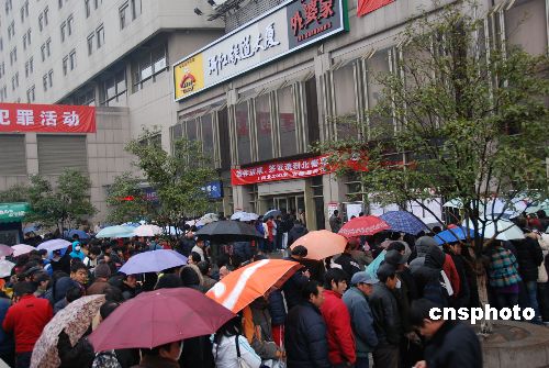 1月7日,在杭州城站火车站的售票大厅门前,排队购票的人群异常拥挤。由于细雨绵绵的天气,使得大厅外排起了雨伞购票的长龙。中新社发 张洁 摄
