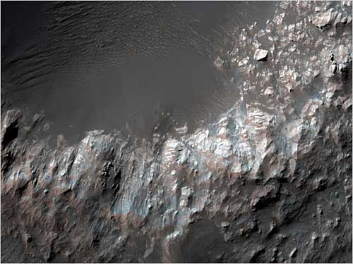 哥伦布陨坑内壁:位于南半球直径60英里(约合96公里)的“哥伦布”陨坑内壁一部分。陨坑壁中存在层状沉积岩——风或水作用下堆积而成。“火星勘察轨道器”的分光仪在水层岩层中发现了含水矿物质,为火星曾存在水提供了更多证据。