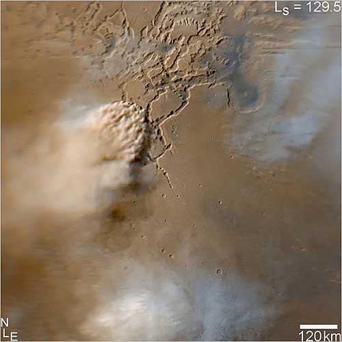 火星尘暴:虽然看起来很像火山喷发,但这张图片实际上反映的是一场尘暴。类似这样的风暴将尘埃颗粒卷到火星地表上空,由于水冰凝结在尘粒上,便形成了我们在图片中看到的纤细的白云。
