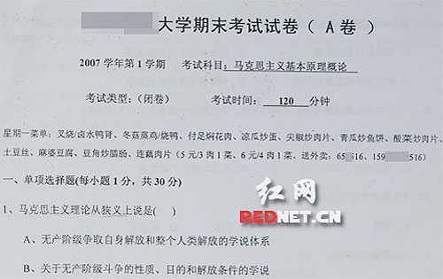 “星期一菜单:叉烧卤水鸭肾,冬菇蒸鸡烧鸭……”近日,一篇题为《受不了了!最雷人的大学试卷印有外卖广告》的帖子在网上流传,从帖中图片可以看到广州某高校期末试卷每一页的空白部分印着快餐店的外卖广告,试卷上显示的是2007学年第1学期,考试科目为马克思主义基本原理概论。这份“史上最雷人的大学试卷”立刻成为网友议论的焦点。