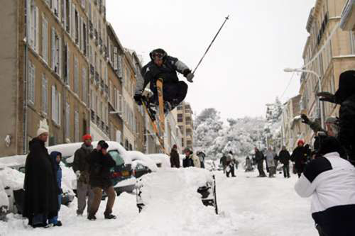 法国第二大城市马赛7日降下大雪,市民在街头练习滑雪。